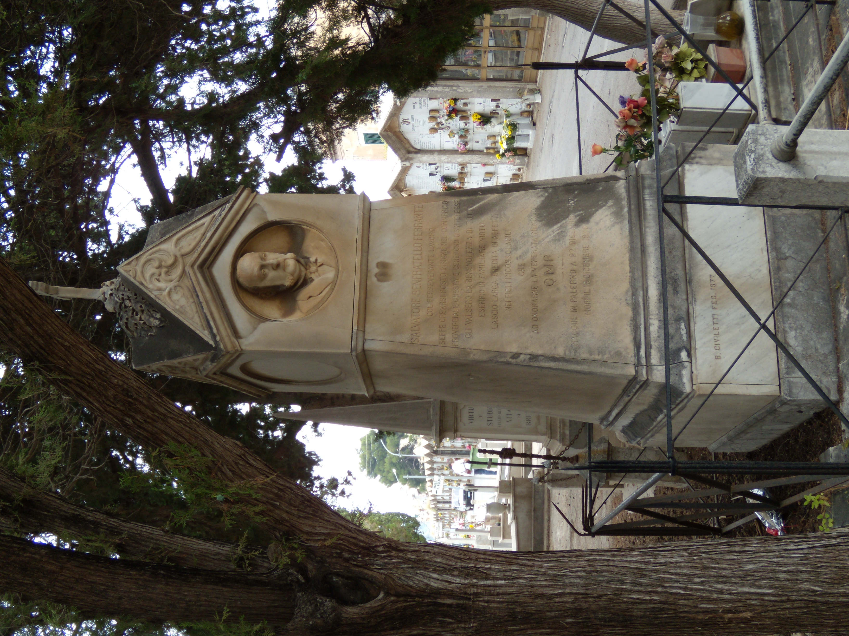 SALVATORE BENFRATELLO FERRANTE / COL PERSEVERANTE LAVORO / SEPPE CREARSI POSTO INSIGNE NEL COMMERCIO / PROVERBIALE ONESTA E GENEROSO DISINTERESSE / GLI VALSERO LA BENEVOLENZA DI TUTTI / ESEMPIO DI FAMILIARE VIRTU / LASCIO LARGA EREDITA DI AFFETTI / NEI FIGLI INCONSOLABILI / CHE / AD ONORARNE LA VENERATA MEMORIA / Q.M.P. / NACQUE IN PALERMO A 22 DICEMBRE 1821 / MORI IL 16 DICEMBRE 1890