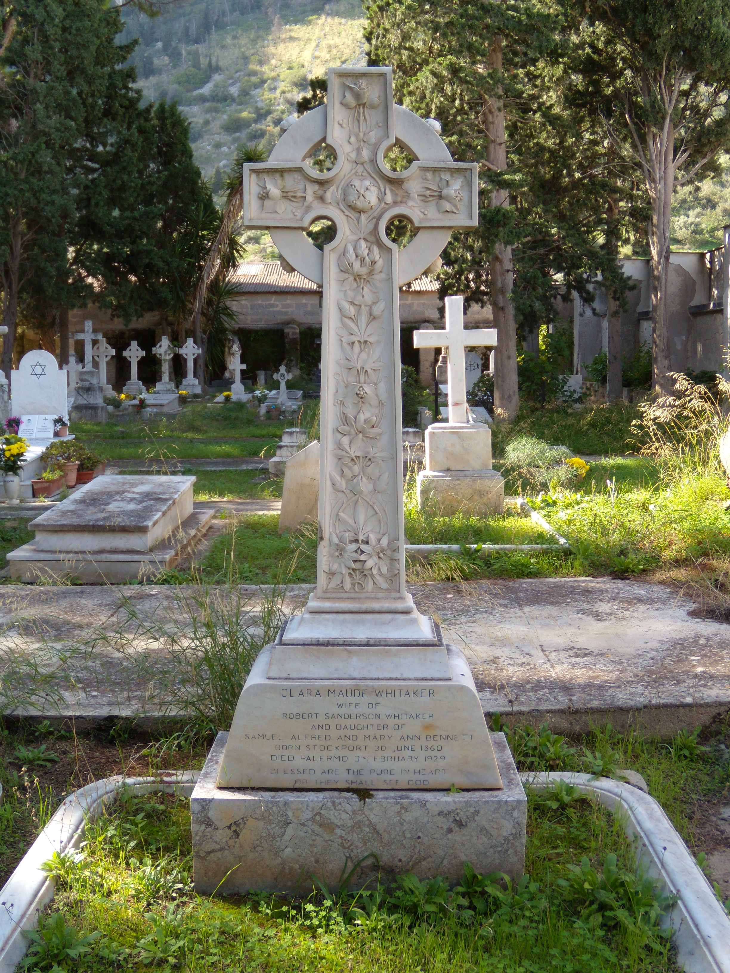CLARA MAUDE WHITAKER / WIFE OF / ROBERT SANDERSON WHITAKER / AND DAUGHTER OF / SAMUEL ALFRED AND MARY ANN BENNETT / BORN STOCKPORT 30 JUNE 1860 / DIED PALERMO 3 FEBRUARY 1929 / BLESSED ARE THE PURE IN HEART / FOR THEY SHALL SEE GOD