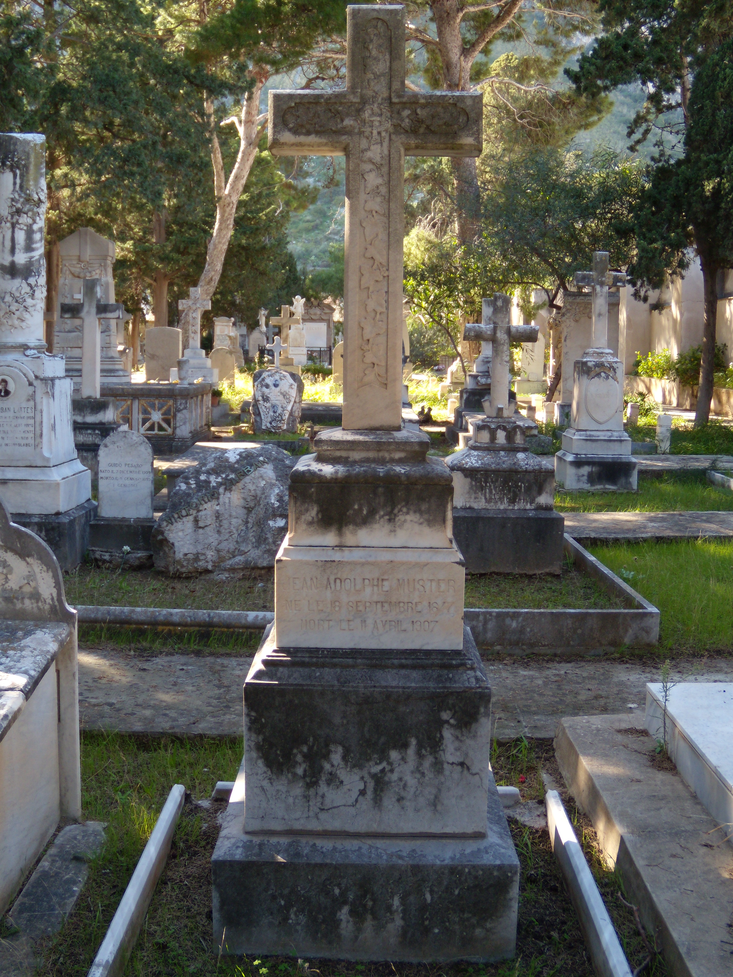 Il monumento a Jean Adolphe Muster è formato da una croce latina con l’edera al centro; è opera dello scultore Valerio Arcara. L’epigrafe è scritta in francese.