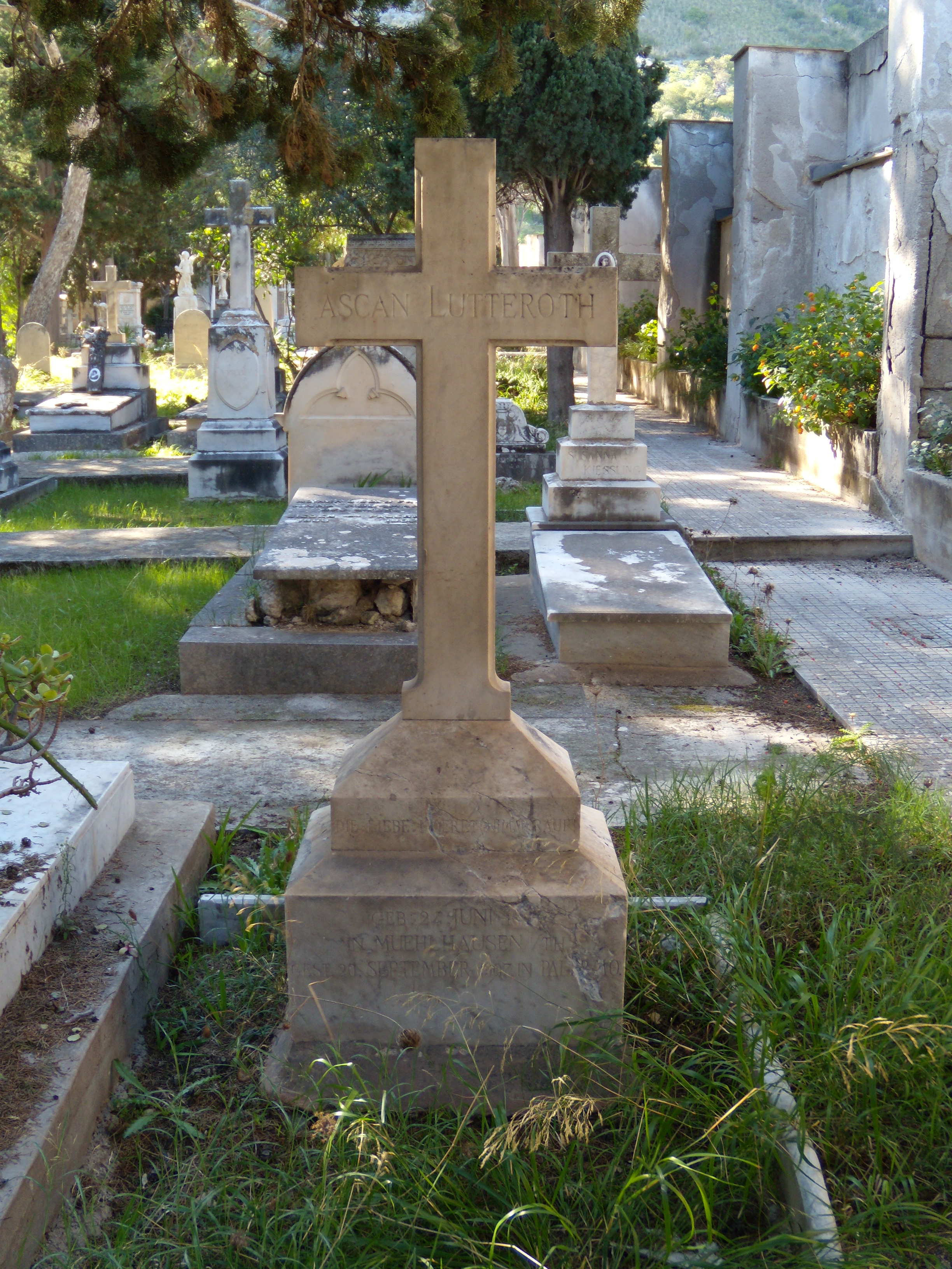 Il monumento ad Ascan Lutteroth è formato da una croce latina semplice; è opera dello scultore Valerio Arcara. L’epigrafe è scritta in tedesco ed è in parte illegibile.