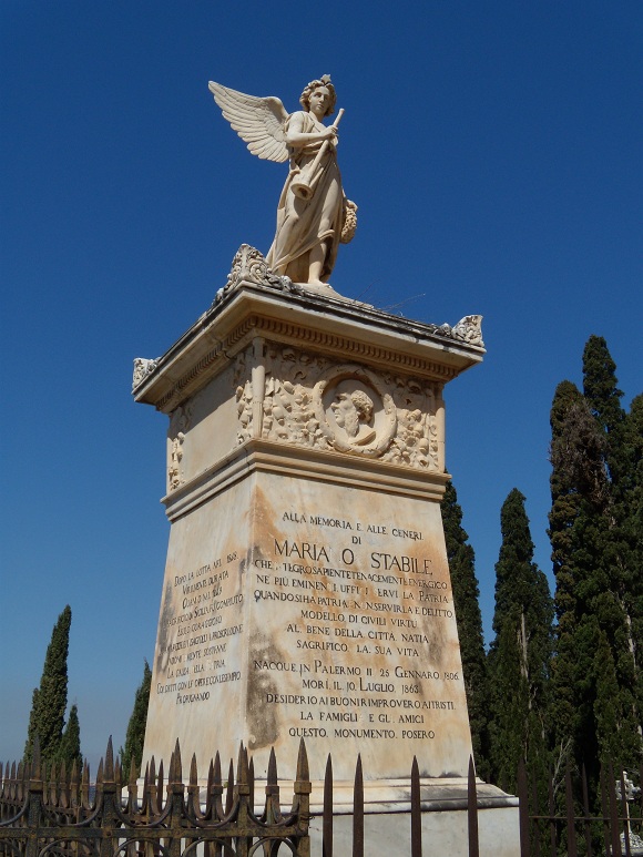 Il monumento allo statista e patriota Mariano Stabile (1806-1863) si trova sul piazzale antistante alla chiesa del convento di Santa Maria di Gesù, dal quale si vede tutta la città di Palermo, ed è stato progettato nel 1864 dall’ingegnere Giuseppe Damiani Almeyda [1]. Un angelo che tiene in mano una tromba e una corona si erge sopra una base quadrangolare i cui quattro lati narrano la vita e l’impegno civile del defunto. Lo statista è rappresentato di profilo in un medaglione posto sul fronte del monumento.