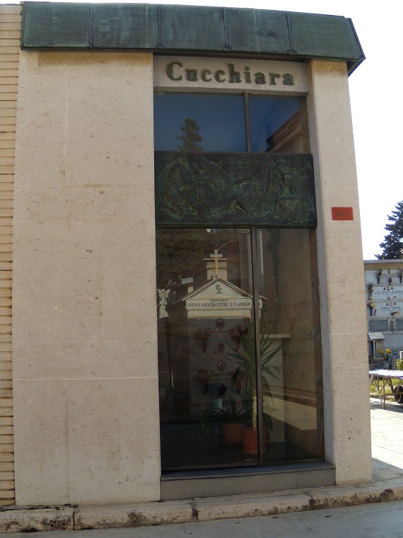 La cappella Cucchiara è l’ultima di una serie di cappelle attaccate l’una all’altra. La costruzione è un parallelepipedo rivestito di lastre di travertino, di diverse dimensioni. L’altro materiale utilizzato è il bronzo in cui è realizzato il coronamento, le lettere del nome, e il bassorilievo inserito dentro la grande vetrata della facciata asimmetrica.