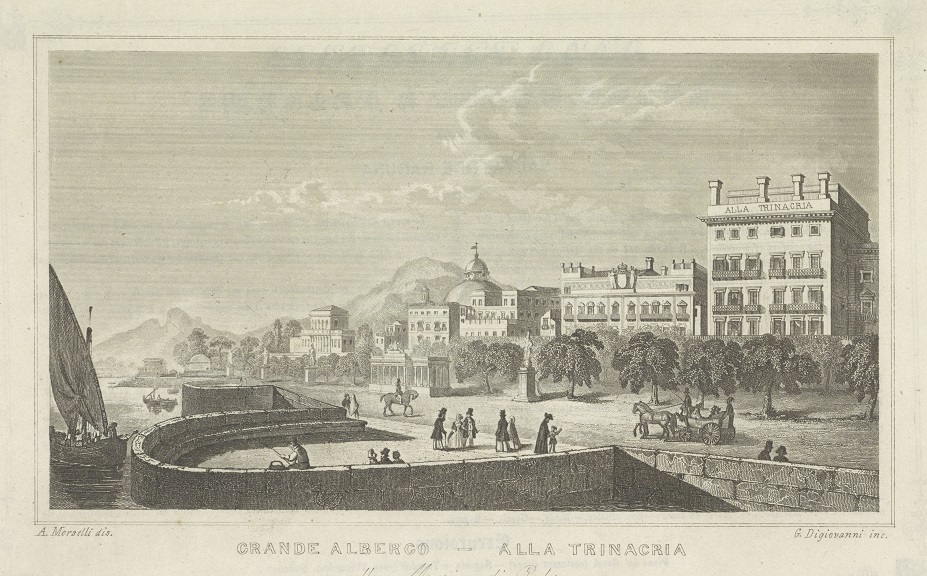 Salvatore Ragusa, di origine genovese, si trasferisce a Palermo dove apre nel 1844 l’albergo Trinacria, inaugurato in pompa magna in presenza del re di Baviera. Fu considerato a lungo il miglior albergo della città, l’unico con vista mare, e i giornali della seconda metà dell’Ottocento raccontano dei prestigiosi ospiti dell’albergo, dal principe Carlo di Prussia (fratello dell’imperatore) al granduca di Baden, dall’imperatore del Brasile durante un suo soggiorno in incognito a Palermo nel gennaio 1877 ai tanti viaggiatori stranieri intenti a fare il Grand Tour che ne parleranno nelle loro memorie. Qui morirà nel 1852 l’esule Nicolae Balcescu, come viene ricordo da una lapide sulla facciata dell’edificio. L’albergo di cui possiamo leggere una descrizione dettaglia nella Guida di Palermo del 1844 scritta da Salvatore Abbate Migliore sarà quindi per molti anni una destinazione prediletta dai viaggiatori italiani e stranieri fino al declino, dopo la morte di Salvatore Ragusa nel 1876, quando gli subentrò suo figlio Ernesto. Un altro suo figlio, Enrico, segui le orme paterne fondando il Grand Hotel delle Palme [1]. Nel 1911 l’albergo cesserà la sua attività e diventerà una residenza privata. Salvatore Ragusa viene anche ricordato per la sua condotta esemplare durante le giornate di Palermo nel 1860, come lo racconta Giuseppe da Forio nel secondo volume della sua Vita di Garibaldi [2] pubblicata nel 1862. Durante i giorni dei bombardamenti l’albergatore diede asilo alle famiglie degli sfollati e accolse diversi ufficiali garibaldini feriti senza chiedere né accettare nessun compenso.