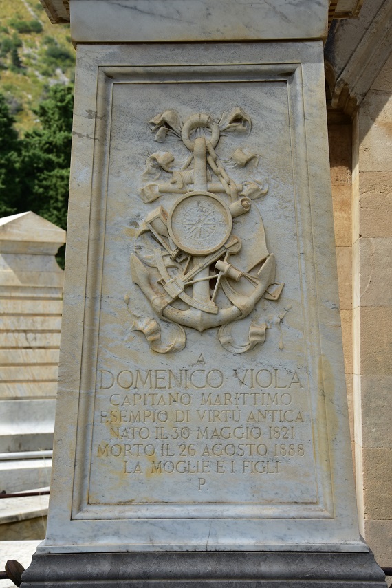 Il monumento funerario del capitano Domenico Viola si trova nella parte destra dell’emiciclo del cimitero di Santa Maria dei Rotoli, accanto alla cappella Gemmellaro. È stato realizzato dall’architetto Antonio Zanca come lo attesta la fotografia dedicata al suo maestro Giuseppe Damiani Almeyda e datata del 1895 che si trova nell’archivio Damiani. È possibile che si tratti anche dell’anno di realizzazione del monumento ma l’assenza sulla fotografia della cappella Gemmellaro, progettata nel 1892, potrebbe lasciare supporre che sia precedente.