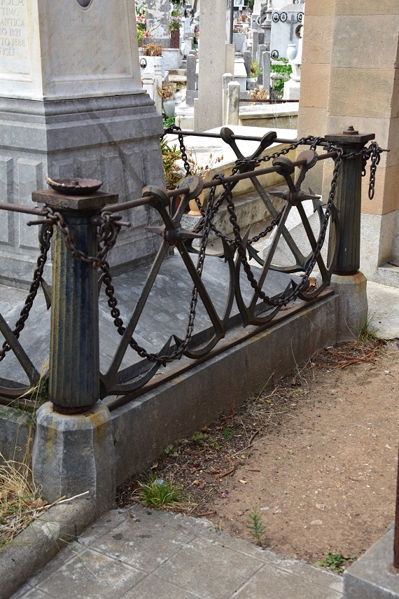 Il monumento funerario è circondato da una recinzione che richiama nuovamente la professione del defunto. Si tratta di ancore incrociate due a due, quattro per ogni lato, legate da catene e unite agli angoli a piccole colonne doriche.