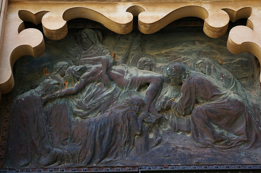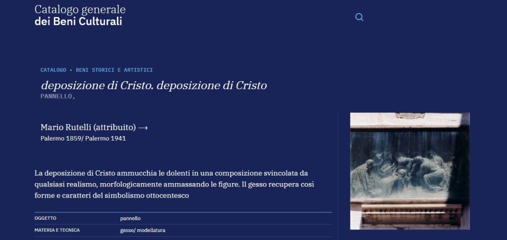 Fra queste schede figura un pannello in gesso attribuito a Mario Rutelli (1859-1941) che si trova oggi nell’oratorio di Santa Caterina d’Alessandria a Palermo. L’attribuzione è legata al fatto che l’opera fu donata dalla famiglia dello scultore all’ordine del Santo Sepolcro nel 1946, anno in cui l’oratorio e i locali annessi furono dati in gestione a quest’ordine religioso. La scheda dell’ICCD è molto scarna e offre ben poche informazioni sull’opera, ma basta confrontare questo pannello in gesso con il bassorilievo in bronzo presente sulla facciata della cappella Rutelli nel cimitero di Sant’Orsola a Palermo, una Deposizione dalla croce di cui ho già parlato, per vedere che si tratta del lavoro preparatorio – con qualche leggera differenza di cui parlerò più avanti – del bassorilievo realizzato da Mario Rutelli per la cappella gentilizia della sua famiglia.