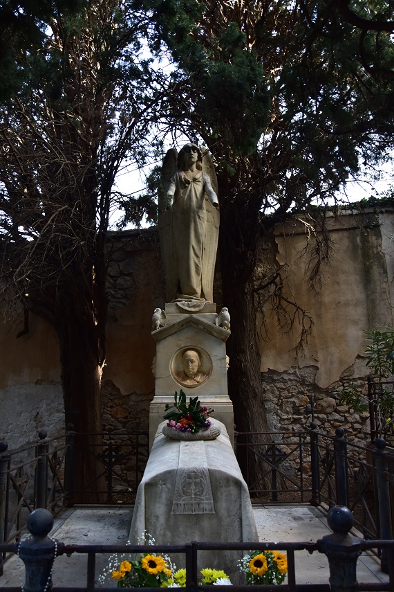 1. Da quanto riportato dal Salvatore Scozzari in “Il cimitero di Santa Maria di Gesù di Palermo” del 1909, le mani dell’angelo erano protese sul davanti “in atto di custodire e di proteggere la bara marmorea”.