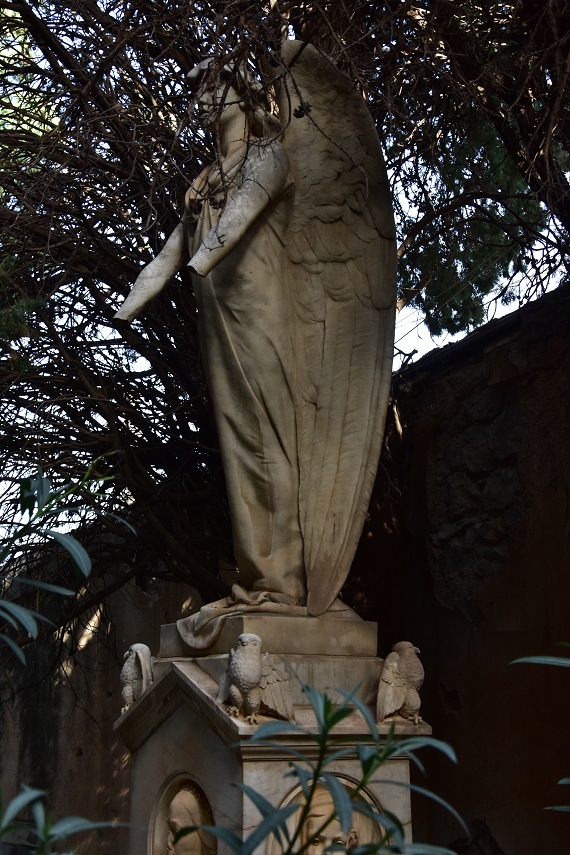 All’estremità vi è un cippo sul quale si erge un angelo dalle lunghe ali semi-spiegate, con grande ricchezza nella resa delle piume. È vestito da un lungo abito a maniche corti che gli ricopre perfino i piedi. Le sue braccia sono distese in avanti ma purtroppo essendo entrambi monche non possiamo sapere cosa teneva sopra la sepoltura. Ai suoi piedi, ai quattro angoli del cippo, sono poggiate quattro civette dalle ali spiegate. Tipico animale notturno che riesce a vedere nelle tenebre, simboleggia la conoscenza e la sopravvivenza alla morte, ma anche la saggezza.