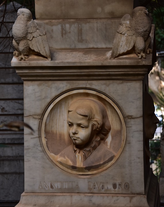 Ciascuno dei quattro lati del cippo presenta al centro un medaglione: sul fronte principale, il medaglione con l’altorilievo di Marianna Cipollina, poi in senso orario troviamo due uomini con folti baffi tipici dell’epoca e una bambina, Annetta Favaloro. Nessuna data di nascita e morte è indicata per i defunti, solo i loro nomi.