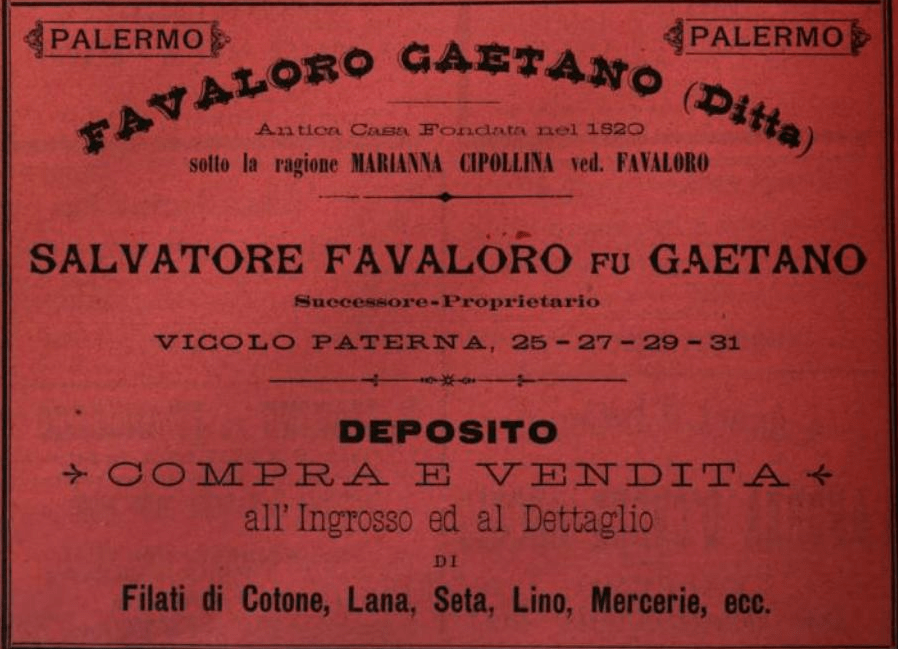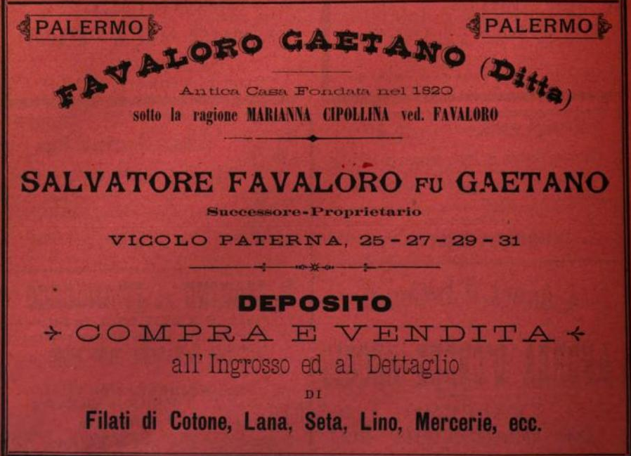 Di Marianna Cipollina, sappiamo che era rimasta vedova di Felice Favaloro. Nel 1820 aveva fondato a Palermo una ditta di compra e vendita all’ingrosso e al dettaglio di filati di cotone, lana, seta, lino, mercerie e altri. La ditta fondata sotto la ragione sociale “Marianna Cipollina ved. Favaloro” fu ripresa dal figlio Gaetano e poi dal nipote Salvatore. Nel 1893 risultava ubicata in vicolo Paterna 25-27-29-31 a Palermo, vicino alla Cala, come risulta dall’Annuario d’Italia, Calendario generale del Regno. Salvatore Favaloro fu il committente del villino Favaloro, progettato da Giovan Battista Filippo Basile, la cui costruzione iniziò nel 1889.