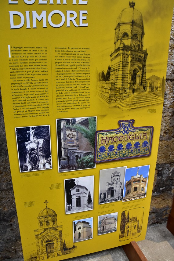 Nell’itinerario Liberty a Palermo sono per ora previsti 6 percorsi in città più un settimo dedicato a Mondello. Ma si può anche pensare che un giorno nasca un percorso Liberty nei cimiteri di Palermo, come già avviene alla Certosa di Bologna, nel cimitero di Staglieno a Genova, al Monumentale di Milano, al Monumentale di Torino, nel cimitero Civico Unico di Bergamo, per citarne solo alcuni.