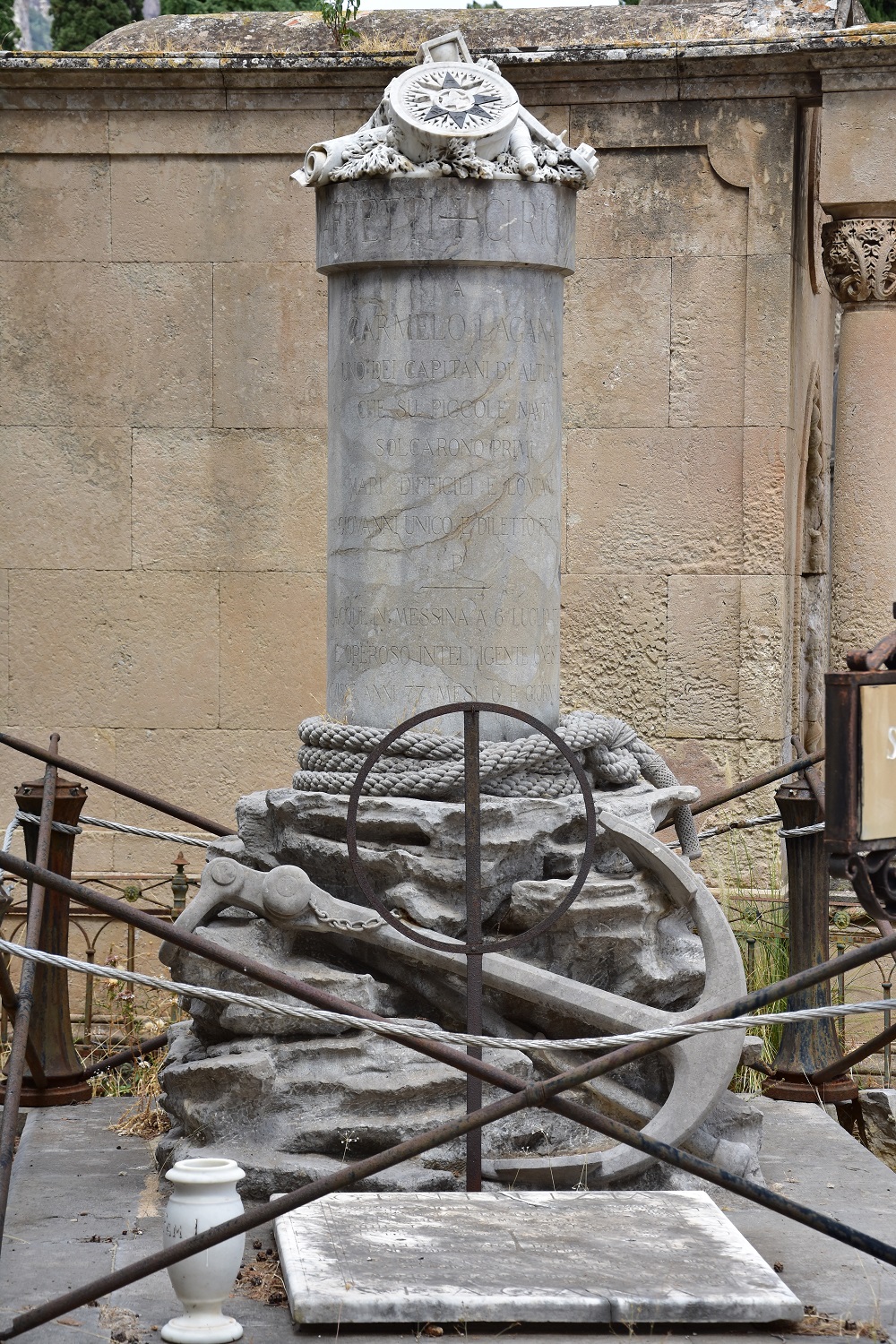 A CARMELO LAGANA / UNO DEI CAPITANI DI ALTURA / CHE SU PICCOLE NAVI / SOLCARONO PRIMI / MARI DIFFICILI E LONTANI / GIOVANNI UNICO E DILETTO FIGLIO / P. / NACQUE IN MESSINA A 6 LUGLIO 1799 / E OPEROSO INTELLIGENTE ONESTO / VISSE ANNI 77 MESI 6 E GIORNI 10