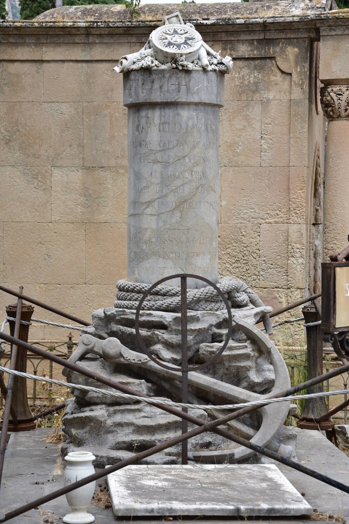 Il monumento funerario di Carmelo Laganà nel cimitero di Santa Maria dei Rotoli fu commissionato da suo figlio Giovanni allo scultore Salvatore Valenti. Venne realizzato nel 1898-99, secondo la biografia dedicata da Filippo Di Pietro allo scultore palermitano[1]. Si trova in una posizione di rilievo, al centro dell’emiciclo del camposanto. Il monumento in pietra di Billiemi è formato da un cippo liscio posto su un basamento che ricorda una roccia, sopra la quale è adagiata una grande ancora, a ricordare la professione del defunto, che era capitano marittimo. Altri elementi scultorei ricordano il legame del defunto con il mare: la corda avvolta alla base del cippo e diversi strumenti di navigazione posti alla sommità del cippo. Questi sono in marmo di Carrara, facendoli così risaltare sul grigio del Billiemi. Il gruppo scultoreo comprende una rosa dei venti, un rotolo di carte nautiche, un sestante, una clessidra e un cannocchiale, con foglie di quercia, simbolo di gloria e di successo, tra di loro. Il monumento è circondato da una recinzione formata da barre metalliche, a forma di arponi, incrociate a X e da corde fini. La sepoltura accoglie inoltre le spoglie di numerosi membri della famiglia Laganà, i cui nomi sono incisi sulla lastra tombale.