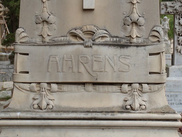Nel cimitero acattolico annesso al cimitero di Santa Maria dei Rotoli, possiamo ammirare l’elegante scritta realizzata dall’architetto Ernesto Armò per il monumento funerario della famiglia Ahrens.