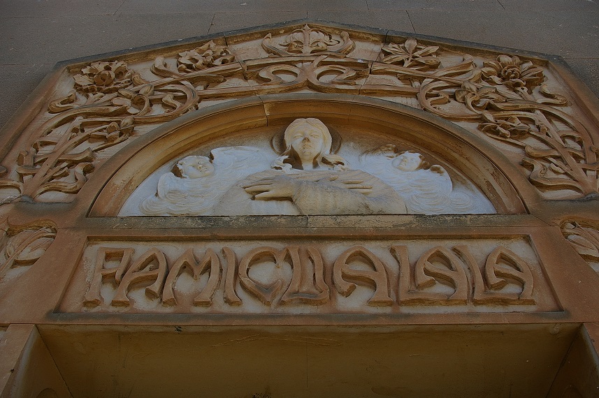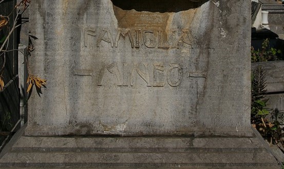 Al contrario, la scritta del monumento funerario della famiglia Mineo è in rilievo. Le lettere presentano varie inclinazioni, con un’assenza di parallelismo che dà dinamismo alla dicitura:
