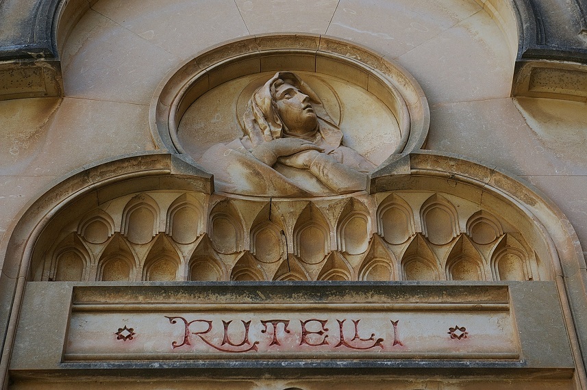 Le lettere della cappella Rutelli, progettata dall’architetto Ernesto Armò, sono incise nella pietra e fortemente curvate, ma restando comunque perfettamente parallele. Presentano importanti variazioni di spessore mentre il colore rosso apporta maggior risalto.