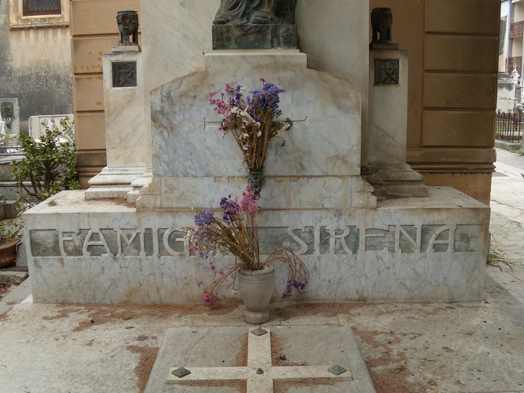 Le lettere del monumento per la famiglia Sirena, realizzato dallo scultore Francesco Garufi, si stagliano su un fondo striato. Sono ricavate nello stesso blocco di marmo di Carrara, con un elegante gioco di pieni e vuoti. Alcune lettere presentano gambe inclinate e la A è concepita in modi diversi (vedere per esempio la prima e l’ultima A).