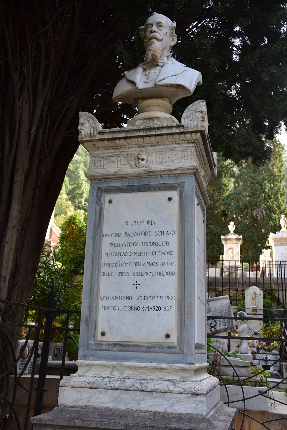 Salvatore Schiavo (1806-1897) è nato a Palermo il 20 dicembre 1806. Magistrato, fu primo presidente della Corte d’Appello di Messina, Parma, Genova e Palermo, come lo ricorda l’epigrafe. Fu anche primo presidente onorario di Cassazione e grande ufficiale dello Stato in Emilia e Liguria. Era uno dei consiglieri alla Corte Suprema di Giustizia che proclamò il Plebiscito siciliano del 21 ottobre 1860. Morì il 4 marzo 1897 all’età di 90 anni.