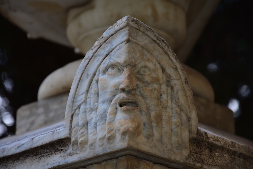 Gli acroteri con sembianze umane presentano un viso severo con un naso aquilino, la fronte aggrottata, la bocca semi aperta, con lunghi boccoli paralleli che scendono ai lati del viso e sotto al mento.
