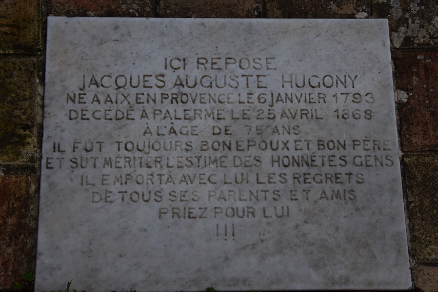 ICI REPOSE / JACQUES AUGUSTE HUGONY / NÉ À AIX EN PROVENCE LE 6 JANVIER 1793 / DÉCÉDÉ À PALERME LE 25 AVRIL 1868 / À L’ÂGE DE 75 ANS / IL FUT TOUJOURS BON ÉPOUX ET BON PÈRE / ET SUT MÉRITER L’ESTIME DES HONNÊTES GENS / IL EMPORTA AVEC LUI LES REGRETS / DE TOUS SES PARENTS ET AMIS / PRIEZ POUR LUI / !!!