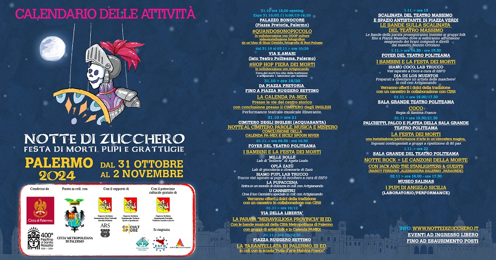 Ritorna a Palermo come ormai ogni anno la manifestazione “Notte di Zucchero” arrivata alla XIIa edizione. L’iniziativa punta a tramandare le tradizioni siciliane della Festa dei Morti con « un modo nuovo di interpretare la festa dei morti a Palermo e raccontare la nostra città » e si svolgerà dal 31 ottobre al 2 novembre 2024.