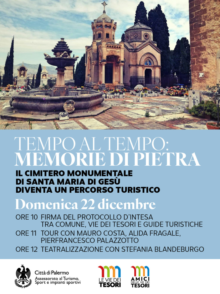Il progetto di valorizzazione delle Vie dei Tesori, sostenuto dall’assessorato comunale al Turismo si chiama “Tempo al Tempo – Memorie di pietra: percorsi guidati e visite teatralizzate alla scoperta del cimitero monumentale” e prevede un protocollo di intesa (in via sperimentale, fino al 30 aprile 2025) tra il Comune, la Fondazione Le Vie dei Tesori, l’associazione Guide turistiche Palermo (Agt), l’Associazione Guide turistiche abilitate (Gta), e l’associazione Guide turistiche italiane (Gti), per organizzare visite guidate nel cimitero. La prima visita guidata avrà quindi luogo domenica 22 dicembre 2024 a partire dalle 11.00 e sarà condotta da Mauro Costa, responsabile della comunicazione della Biblioteca Leonardo Sciascia, dalla guida turistica Alida Fragale e da Pierfrancesco Palazzotto, studioso e docente dell’Università di Palermo. Alla fine della visita l’attrice Stefania Blandeburgo si esibirà «nei panni di Ilaria La Grua, antenata della baronessa di Carini che, davanti al mausoleo dei Florio, racconta le sue ‘conversazioni’ nell’aldilà con Franca Florio». La partecipazione è gratuita.