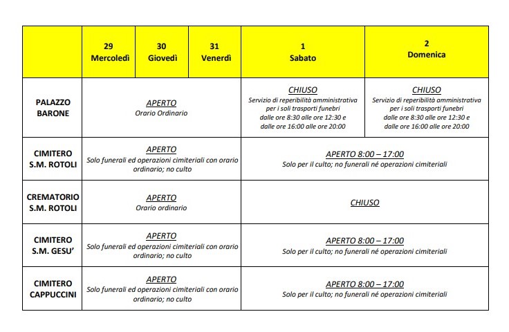 Le aperture dei cimiteri saranno prolungate in occasione della ricorrenza. Mentre i tre cimiteri pubblici (Santa Maria di Gesù, Cappuccini e Santa Maria dei Rotoli) saranno aperti dalle ore 8.00 alle 17.00 nei giorni 1 e 2 novembre 2025, il cimitero di Sant’Orsola resterà aperto ininterrottamente dalle ore 7.30 alle 16.30 dal 31 ottobre al 2 novembre 2025.
