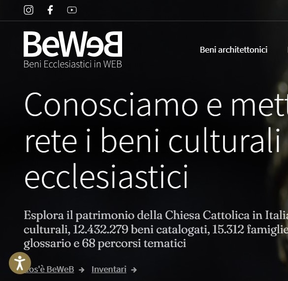 Beni Ecclesiastici in WEB è la vetrina che rende visibile il lavoro di censimento sistematico del patrimonio storico e artistico, architettonico, archivistico e librario portato avanti dalle diocesi italiane e dagli istituti culturali ecclesiastici sui beni di loro proprietà. Comprende le sezioni Beni architettonici, Beni storici e artistici, Beni librari, Beni archivistici e Istituti culturali.
