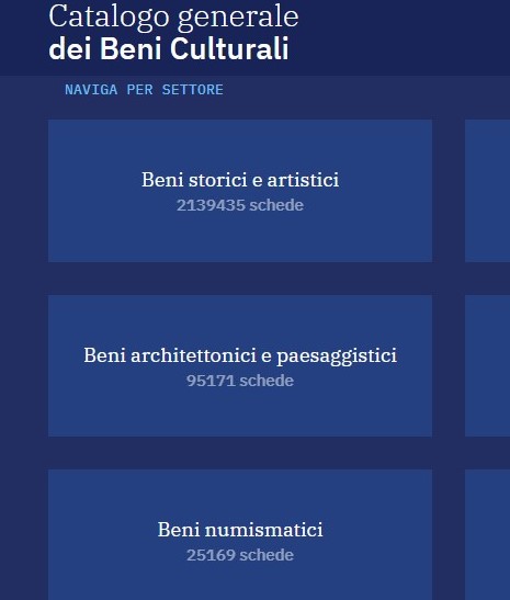 Il nuovo portale del Catalogo generale dei beni culturali realizzato dall’Istituto centrale per il catalogo e la documentazione (ICCD) lanciato nel febbraio 2021 ha reso gratuitamente e liberamente fruibile le schede relative al patrimonio culturale italiano. Il progetto è in continuo aggiornamento e il numero di schede va crescendo nel corso dei mesi.