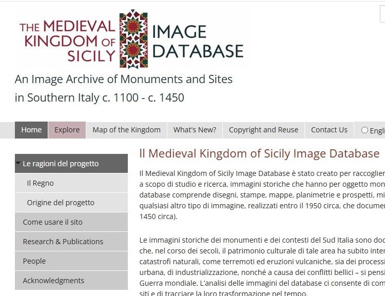 Il Medieval Kingdom of Sicily Image Database è stato creato per raccogliere, organizzare e rendere accessibili, a scopo di studio e ricerca, immagini storiche che hanno per oggetto monumenti e città del Sud Italia. Il database comprende disegni, stampe, mappe, planimetrie e prospetti, miniature, dipinti, antiche fotografie e qualsiasi altro tipo di immagine, realizzati entro il 1950 circa, che documentino siti del Regno di Sicilia (1100 – 1450 circa).